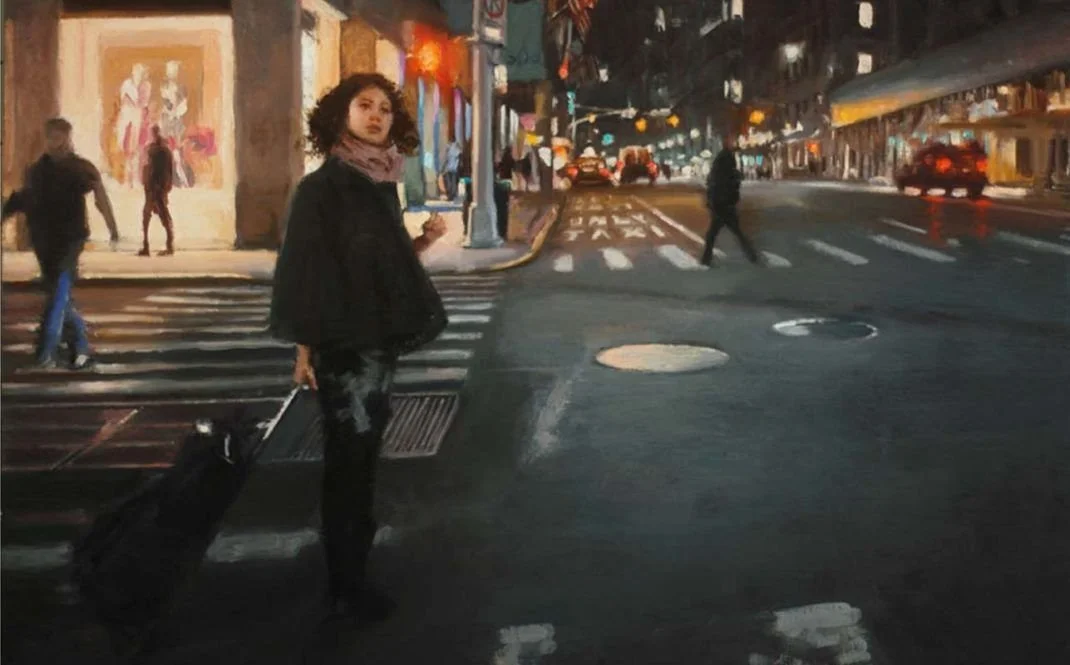 Left: Girl with a Suitcase, 22" x 28", Oil on linen